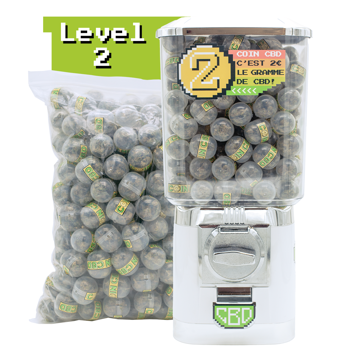 Vous souhaitez passer au level supérieur et opter pour une solution encore plus rentable ? Le distributeur automatique COIN CBD Level 2 est plus rentable. Avec le Starter Pack Level 2, profitez d’une machine de distribution automatique fonctionnant avec des pièces de 2 € et d’un stock doublé de 400 capsules de 1 g de CBD premium. Une opportunité idéale pour maximiser vos ventes et offrir à vos clients un accès simple, rapide et autonome au CBD.